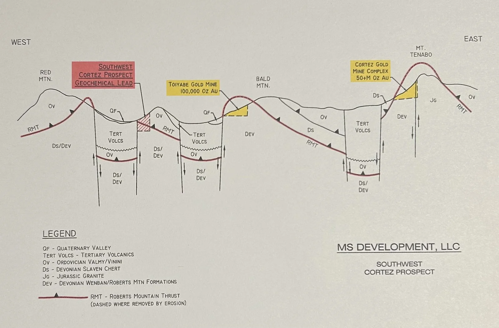 The SW Cortez claim block is a Carlin style exploration prospect southwest of the Cortez and Toiyabe mines. Surface rocks are the upper plate Vinini Formation with anomalous As up to 403 PPM, Hg up to 25 PPM and Sb up to 132 PPM. The east-dipping positive fault block is truncated to the west by a down-to-the-west fault. Objective is the drilling through the upper plate, Roberts Mountain Fault and into the footwall sediments as are productive in the Cortez and Toiyabe mines.
